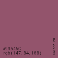 Цвет #93546C в цветовой модели RGB обозначается тремя октетами (147, 84, 108) в десятичном формате и #93546C в шестнадцатиричном (hex) формате, которые являются интенсивностью красного 147 (hex 93), интенсивность зелёного 84 (hex 54) и интенсивность синего 108 (hex 6C).