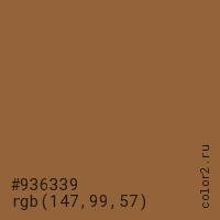 Цвет #936339 в цветовой модели RGB обозначается тремя октетами (147, 99, 57) в десятичном формате и #936339 в шестнадцатиричном (hex) формате, которые являются интенсивностью красного 147 (hex 93), интенсивность зелёного 99 (hex 63) и интенсивность синего 57 (hex 39).
