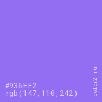 Цвет #936EF2 в цветовой модели RGB обозначается тремя октетами (147, 110, 242) в десятичном формате и #936EF2 в шестнадцатиричном (hex) формате, которые являются интенсивностью красного 147 (hex 93), интенсивность зелёного 110 (hex 6E) и интенсивность синего 242 (hex F2).