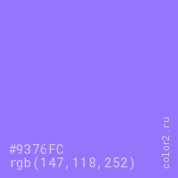 Цвет #9376FC в цветовой модели RGB обозначается тремя октетами (147, 118, 252) в десятичном формате и #9376FC в шестнадцатиричном (hex) формате, которые являются интенсивностью красного 147 (hex 93), интенсивность зелёного 118 (hex 76) и интенсивность синего 252 (hex FC).