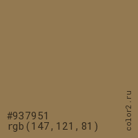 Цвет #937951 в цветовой модели RGB обозначается тремя октетами (147, 121, 81) в десятичном формате и #937951 в шестнадцатиричном (hex) формате, которые являются интенсивностью красного 147 (hex 93), интенсивность зелёного 121 (hex 79) и интенсивность синего 81 (hex 51).