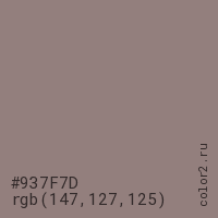 Цвет #937F7D в цветовой модели RGB обозначается тремя октетами (147, 127, 125) в десятичном формате и #937F7D в шестнадцатиричном (hex) формате, которые являются интенсивностью красного 147 (hex 93), интенсивность зелёного 127 (hex 7F) и интенсивность синего 125 (hex 7D).