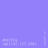 Цвет #937FFA в цветовой модели RGB обозначается тремя октетами (147, 127, 250) в десятичном формате и #937FFA в шестнадцатиричном (hex) формате, которые являются интенсивностью красного 147 (hex 93), интенсивность зелёного 127 (hex 7F) и интенсивность синего 250 (hex FA).