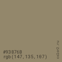 Цвет #93876B в цветовой модели RGB обозначается тремя октетами (147, 135, 107) в десятичном формате и #93876B в шестнадцатиричном (hex) формате, которые являются интенсивностью красного 147 (hex 93), интенсивность зелёного 135 (hex 87) и интенсивность синего 107 (hex 6B).