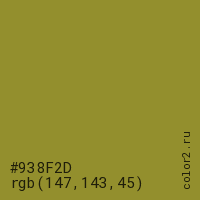 Цвет #938F2D в цветовой модели RGB обозначается тремя октетами (147, 143, 45) в десятичном формате и #938F2D в шестнадцатиричном (hex) формате, которые являются интенсивностью красного 147 (hex 93), интенсивность зелёного 143 (hex 8F) и интенсивность синего 45 (hex 2D).