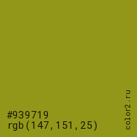 Цвет #939719 в цветовой модели RGB обозначается тремя октетами (147, 151, 25) в десятичном формате и #939719 в шестнадцатиричном (hex) формате, которые являются интенсивностью красного 147 (hex 93), интенсивность зелёного 151 (hex 97) и интенсивность синего 25 (hex 19).