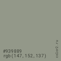 Цвет #939889 в цветовой модели RGB обозначается тремя октетами (147, 152, 137) в десятичном формате и #939889 в шестнадцатиричном (hex) формате, которые являются интенсивностью красного 147 (hex 93), интенсивность зелёного 152 (hex 98) и интенсивность синего 137 (hex 89).