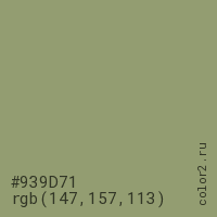 Цвет #939D71 в цветовой модели RGB обозначается тремя октетами (147, 157, 113) в десятичном формате и #939D71 в шестнадцатиричном (hex) формате, которые являются интенсивностью красного 147 (hex 93), интенсивность зелёного 157 (hex 9D) и интенсивность синего 113 (hex 71).