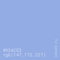Цвет #93ACE3 в цветовой модели RGB обозначается тремя октетами (147, 172, 227) в десятичном формате и #93ACE3 в шестнадцатиричном (hex) формате, которые являются интенсивностью красного 147 (hex 93), интенсивность зелёного 172 (hex AC) и интенсивность синего 227 (hex E3).