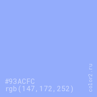 Цвет #93ACFC в цветовой модели RGB обозначается тремя октетами (147, 172, 252) в десятичном формате и #93ACFC в шестнадцатиричном (hex) формате, которые являются интенсивностью красного 147 (hex 93), интенсивность зелёного 172 (hex AC) и интенсивность синего 252 (hex FC).