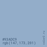 Цвет #93ADC9 в цветовой модели RGB обозначается тремя октетами (147, 173, 201) в десятичном формате и #93ADC9 в шестнадцатиричном (hex) формате, которые являются интенсивностью красного 147 (hex 93), интенсивность зелёного 173 (hex AD) и интенсивность синего 201 (hex C9).