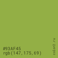 Цвет #93AF45 в цветовой модели RGB обозначается тремя октетами (147, 175, 69) в десятичном формате и #93AF45 в шестнадцатиричном (hex) формате, которые являются интенсивностью красного 147 (hex 93), интенсивность зелёного 175 (hex AF) и интенсивность синего 69 (hex 45).