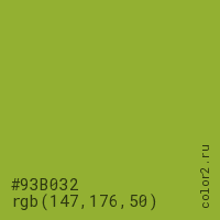 Цвет #93B032 в цветовой модели RGB обозначается тремя октетами (147, 176, 50) в десятичном формате и #93B032 в шестнадцатиричном (hex) формате, которые являются интенсивностью красного 147 (hex 93), интенсивность зелёного 176 (hex B0) и интенсивность синего 50 (hex 32).