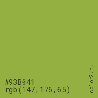 Цвет #93B041 в цветовой модели RGB обозначается тремя октетами (147, 176, 65) в десятичном формате и #93B041 в шестнадцатиричном (hex) формате, которые являются интенсивностью красного 147 (hex 93), интенсивность зелёного 176 (hex B0) и интенсивность синего 65 (hex 41).