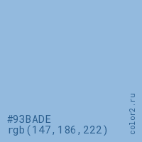 Цвет #93BADE в цветовой модели RGB обозначается тремя октетами (147, 186, 222) в десятичном формате и #93BADE в шестнадцатиричном (hex) формате, которые являются интенсивностью красного 147 (hex 93), интенсивность зелёного 186 (hex BA) и интенсивность синего 222 (hex DE).
