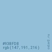 Цвет #93BFD8 в цветовой модели RGB обозначается тремя октетами (147, 191, 216) в десятичном формате и #93BFD8 в шестнадцатиричном (hex) формате, которые являются интенсивностью красного 147 (hex 93), интенсивность зелёного 191 (hex BF) и интенсивность синего 216 (hex D8).