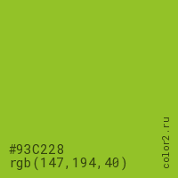 Цвет #93C228 в цветовой модели RGB обозначается тремя октетами (147, 194, 40) в десятичном формате и #93C228 в шестнадцатиричном (hex) формате, которые являются интенсивностью красного 147 (hex 93), интенсивность зелёного 194 (hex C2) и интенсивность синего 40 (hex 28).