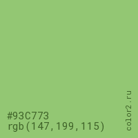 Цвет #93C773 в цветовой модели RGB обозначается тремя октетами (147, 199, 115) в десятичном формате и #93C773 в шестнадцатиричном (hex) формате, которые являются интенсивностью красного 147 (hex 93), интенсивность зелёного 199 (hex C7) и интенсивность синего 115 (hex 73).