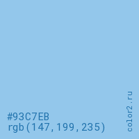 Цвет #93C7EB в цветовой модели RGB обозначается тремя октетами (147, 199, 235) в десятичном формате и #93C7EB в шестнадцатиричном (hex) формате, которые являются интенсивностью красного 147 (hex 93), интенсивность зелёного 199 (hex C7) и интенсивность синего 235 (hex EB).