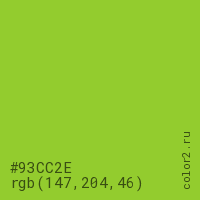 Цвет #93CC2E в цветовой модели RGB обозначается тремя октетами (147, 204, 46) в десятичном формате и #93CC2E в шестнадцатиричном (hex) формате, которые являются интенсивностью красного 147 (hex 93), интенсивность зелёного 204 (hex CC) и интенсивность синего 46 (hex 2E).