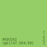 Цвет #93CC62 в цветовой модели RGB обозначается тремя октетами (147, 204, 98) в десятичном формате и #93CC62 в шестнадцатиричном (hex) формате, которые являются интенсивностью красного 147 (hex 93), интенсивность зелёного 204 (hex CC) и интенсивность синего 98 (hex 62).