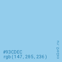 Цвет #93CDEC в цветовой модели RGB обозначается тремя октетами (147, 205, 236) в десятичном формате и #93CDEC в шестнадцатиричном (hex) формате, которые являются интенсивностью красного 147 (hex 93), интенсивность зелёного 205 (hex CD) и интенсивность синего 236 (hex EC).