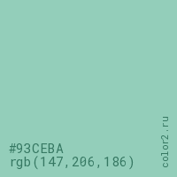 Цвет #93CEBA в цветовой модели RGB обозначается тремя октетами (147, 206, 186) в десятичном формате и #93CEBA в шестнадцатиричном (hex) формате, которые являются интенсивностью красного 147 (hex 93), интенсивность зелёного 206 (hex CE) и интенсивность синего 186 (hex BA).