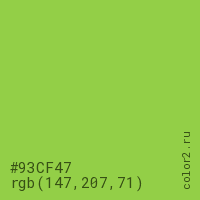 Цвет #93CF47 в цветовой модели RGB обозначается тремя октетами (147, 207, 71) в десятичном формате и #93CF47 в шестнадцатиричном (hex) формате, которые являются интенсивностью красного 147 (hex 93), интенсивность зелёного 207 (hex CF) и интенсивность синего 71 (hex 47).