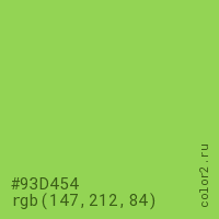 Цвет #93D454 в цветовой модели RGB обозначается тремя октетами (147, 212, 84) в десятичном формате и #93D454 в шестнадцатиричном (hex) формате, которые являются интенсивностью красного 147 (hex 93), интенсивность зелёного 212 (hex D4) и интенсивность синего 84 (hex 54).