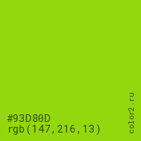 Цвет #93D80D в цветовой модели RGB обозначается тремя октетами (147, 216, 13) в десятичном формате и #93D80D в шестнадцатиричном (hex) формате, которые являются интенсивностью красного 147 (hex 93), интенсивность зелёного 216 (hex D8) и интенсивность синего 13 (hex 0D).
