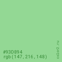 Цвет #93D894 в цветовой модели RGB обозначается тремя октетами (147, 216, 148) в десятичном формате и #93D894 в шестнадцатиричном (hex) формате, которые являются интенсивностью красного 147 (hex 93), интенсивность зелёного 216 (hex D8) и интенсивность синего 148 (hex 94).