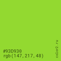 Цвет #93D930 в цветовой модели RGB обозначается тремя октетами (147, 217, 48) в десятичном формате и #93D930 в шестнадцатиричном (hex) формате, которые являются интенсивностью красного 147 (hex 93), интенсивность зелёного 217 (hex D9) и интенсивность синего 48 (hex 30).