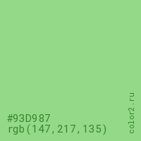 Цвет #93D987 в цветовой модели RGB обозначается тремя октетами (147, 217, 135) в десятичном формате и #93D987 в шестнадцатиричном (hex) формате, которые являются интенсивностью красного 147 (hex 93), интенсивность зелёного 217 (hex D9) и интенсивность синего 135 (hex 87).
