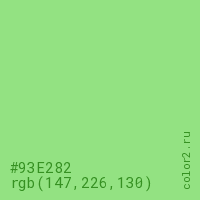 Цвет #93E282 в цветовой модели RGB обозначается тремя октетами (147, 226, 130) в десятичном формате и #93E282 в шестнадцатиричном (hex) формате, которые являются интенсивностью красного 147 (hex 93), интенсивность зелёного 226 (hex E2) и интенсивность синего 130 (hex 82).