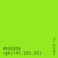 Цвет #93E820 в цветовой модели RGB обозначается тремя октетами (147, 232, 32) в десятичном формате и #93E820 в шестнадцатиричном (hex) формате, которые являются интенсивностью красного 147 (hex 93), интенсивность зелёного 232 (hex E8) и интенсивность синего 32 (hex 20).