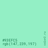 Цвет #93EFC5 в цветовой модели RGB обозначается тремя октетами (147, 239, 197) в десятичном формате и #93EFC5 в шестнадцатиричном (hex) формате, которые являются интенсивностью красного 147 (hex 93), интенсивность зелёного 239 (hex EF) и интенсивность синего 197 (hex C5).