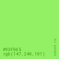 Цвет #93F065 в цветовой модели RGB обозначается тремя октетами (147, 240, 101) в десятичном формате и #93F065 в шестнадцатиричном (hex) формате, которые являются интенсивностью красного 147 (hex 93), интенсивность зелёного 240 (hex F0) и интенсивность синего 101 (hex 65).
