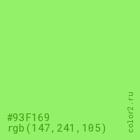 Цвет #93F169 в цветовой модели RGB обозначается тремя октетами (147, 241, 105) в десятичном формате и #93F169 в шестнадцатиричном (hex) формате, которые являются интенсивностью красного 147 (hex 93), интенсивность зелёного 241 (hex F1) и интенсивность синего 105 (hex 69).