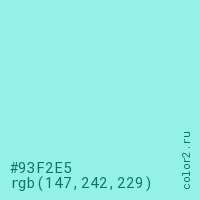 Цвет #93F2E5 в цветовой модели RGB обозначается тремя октетами (147, 242, 229) в десятичном формате и #93F2E5 в шестнадцатиричном (hex) формате, которые являются интенсивностью красного 147 (hex 93), интенсивность зелёного 242 (hex F2) и интенсивность синего 229 (hex E5).