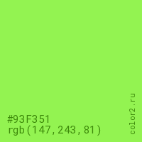 Цвет #93F351 в цветовой модели RGB обозначается тремя октетами (147, 243, 81) в десятичном формате и #93F351 в шестнадцатиричном (hex) формате, которые являются интенсивностью красного 147 (hex 93), интенсивность зелёного 243 (hex F3) и интенсивность синего 81 (hex 51).