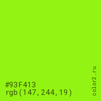 Цвет #93F413 в цветовой модели RGB обозначается тремя октетами (147, 244, 19) в десятичном формате и #93F413 в шестнадцатиричном (hex) формате, которые являются интенсивностью красного 147 (hex 93), интенсивность зелёного 244 (hex F4) и интенсивность синего 19 (hex 13).