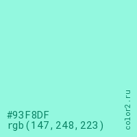 Цвет #93F8DF в цветовой модели RGB обозначается тремя октетами (147, 248, 223) в десятичном формате и #93F8DF в шестнадцатиричном (hex) формате, которые являются интенсивностью красного 147 (hex 93), интенсивность зелёного 248 (hex F8) и интенсивность синего 223 (hex DF).