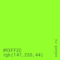 Цвет #93FF2C в цветовой модели RGB обозначается тремя октетами (147, 255, 44) в десятичном формате и #93FF2C в шестнадцатиричном (hex) формате, которые являются интенсивностью красного 147 (hex 93), интенсивность зелёного 255 (hex FF) и интенсивность синего 44 (hex 2C).