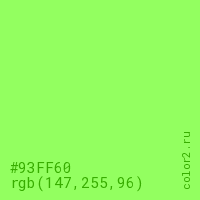 Цвет #93FF60 в цветовой модели RGB обозначается тремя октетами (147, 255, 96) в десятичном формате и #93FF60 в шестнадцатиричном (hex) формате, которые являются интенсивностью красного 147 (hex 93), интенсивность зелёного 255 (hex FF) и интенсивность синего 96 (hex 60).