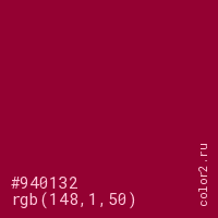 Цвет #940132 в цветовой модели RGB обозначается тремя октетами (148, 1, 50) в десятичном формате и #940132 в шестнадцатиричном (hex) формате, которые являются интенсивностью красного 148 (hex 94), интенсивность зелёного 1 (hex 01) и интенсивность синего 50 (hex 32).