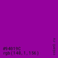 Цвет #94019C в цветовой модели RGB обозначается тремя октетами (148, 1, 156) в десятичном формате и #94019C в шестнадцатиричном (hex) формате, которые являются интенсивностью красного 148 (hex 94), интенсивность зелёного 1 (hex 01) и интенсивность синего 156 (hex 9C).