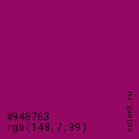 Цвет #940763 в цветовой модели RGB обозначается тремя октетами (148, 7, 99) в десятичном формате и #940763 в шестнадцатиричном (hex) формате, которые являются интенсивностью красного 148 (hex 94), интенсивность зелёного 7 (hex 07) и интенсивность синего 99 (hex 63).