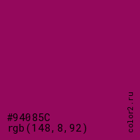 Цвет #94085C в цветовой модели RGB обозначается тремя октетами (148, 8, 92) в десятичном формате и #94085C в шестнадцатиричном (hex) формате, которые являются интенсивностью красного 148 (hex 94), интенсивность зелёного 8 (hex 08) и интенсивность синего 92 (hex 5C).