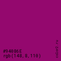 Цвет #94086E в цветовой модели RGB обозначается тремя октетами (148, 8, 110) в десятичном формате и #94086E в шестнадцатиричном (hex) формате, которые являются интенсивностью красного 148 (hex 94), интенсивность зелёного 8 (hex 08) и интенсивность синего 110 (hex 6E).