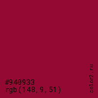 Цвет #940933 в цветовой модели RGB обозначается тремя октетами (148, 9, 51) в десятичном формате и #940933 в шестнадцатиричном (hex) формате, которые являются интенсивностью красного 148 (hex 94), интенсивность зелёного 9 (hex 09) и интенсивность синего 51 (hex 33).